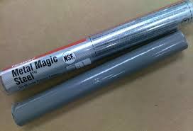 Loctite fixmaster metal magic steel. Steel epoxy in stic form. Cut off a section, knead and apply to leaking pipes or damaged equipment. Cure in 10 minutes . NSF approved for potable water applications.